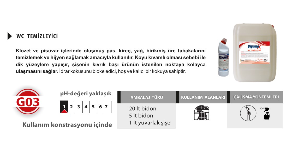 Klozet ve pisuvar içlerinde oluşmuş pas, kireç yağ, birikmiş üre tabakalarını temizlemek ve hijyen sağlamak amacıyla kullanılır.