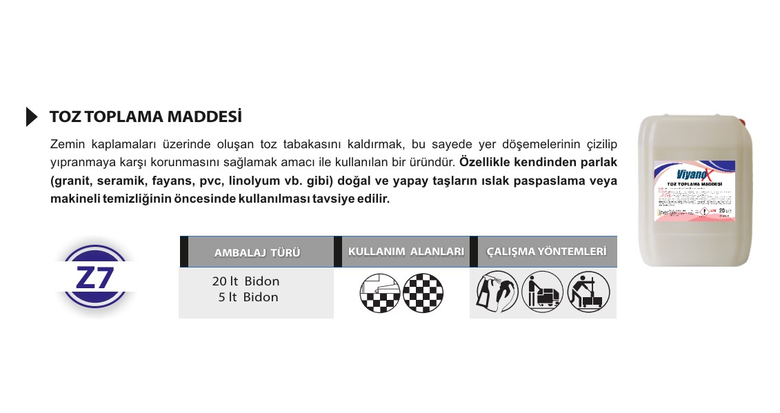 Zemin kaplamalarında oluşan toz tabakasını kaldırmak, bu sayede yer döşemelerinin çizilip yıpranmaya karşı korunmasını sağlamak amacı ile kullanılan bir üründür.